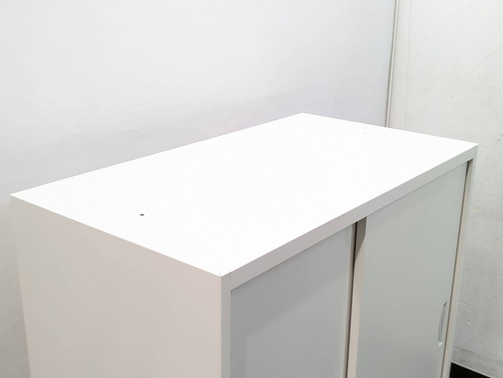 生興製クウォールシリーズの引き違いスチール書庫です。幅900mm・幅500mmの設計で、鍵付き扉と可動棚2枚、ベースが付属しています。ホワイトカラーのシンプルなデザインで、書類や備品の収納に最適な国内メーカー製キャビネットです。