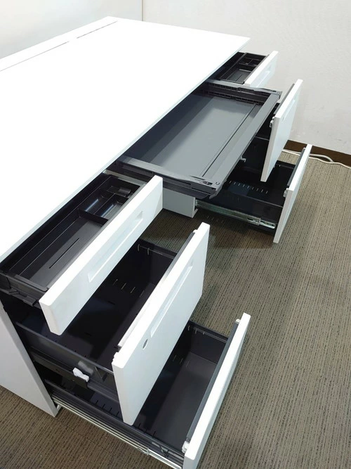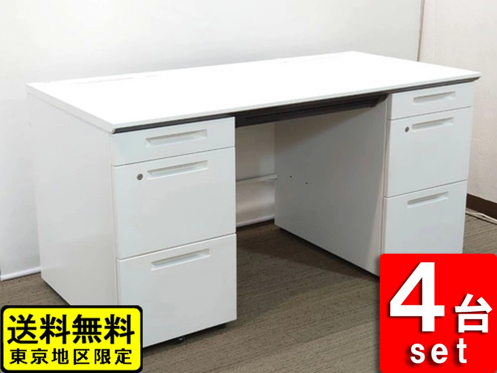 コクヨ isシリーズの両袖デスク4台セットです。カギ・コードホール・センター引出しが付属しています。サイズは幅1400mm×奥行き650mm×高さ720mm、カラーはホワイトです。カギはご注文後に手配し、後日納品先へ送付いたします。在庫8台ございます。