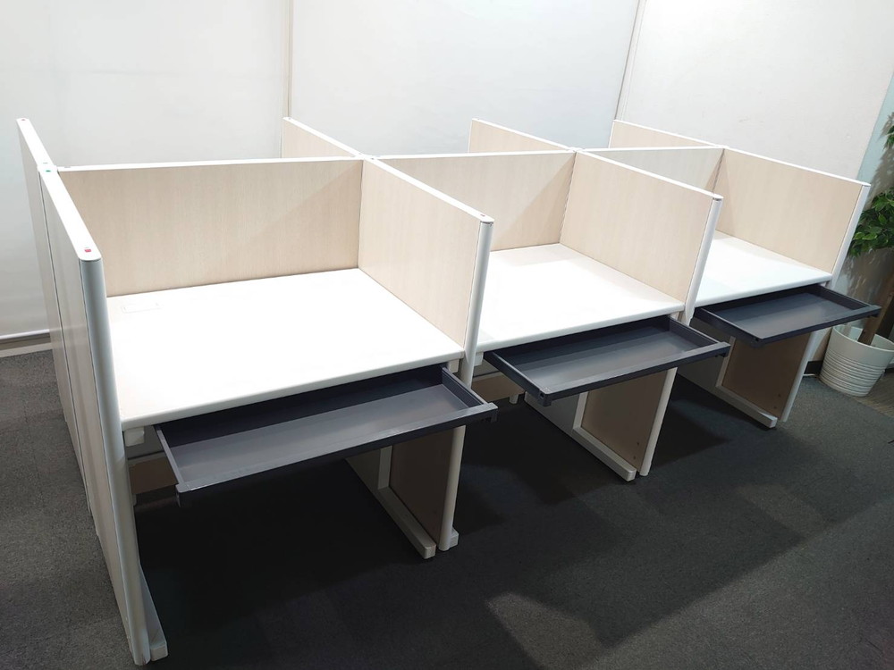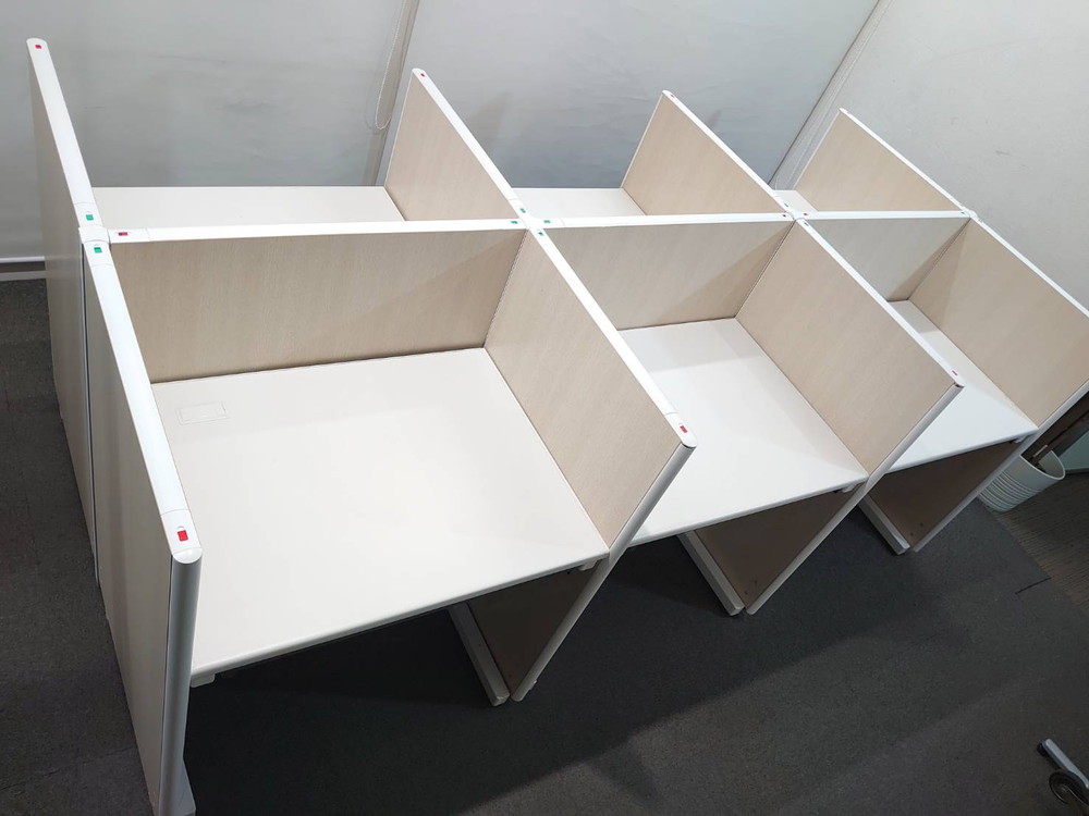 6名用のパネルデスクセット(対面タイプ)です。デスクはコクヨ製の平デスクを使用しており、引き出しとコードホールが付属しています。パネル付きのため、集中スペースや個別学習、自習室、予備校、スクール、図書館、コンタクトセンター、カスタマーケアセンターなど、周囲の視線を遮りたい環境に適しています。
