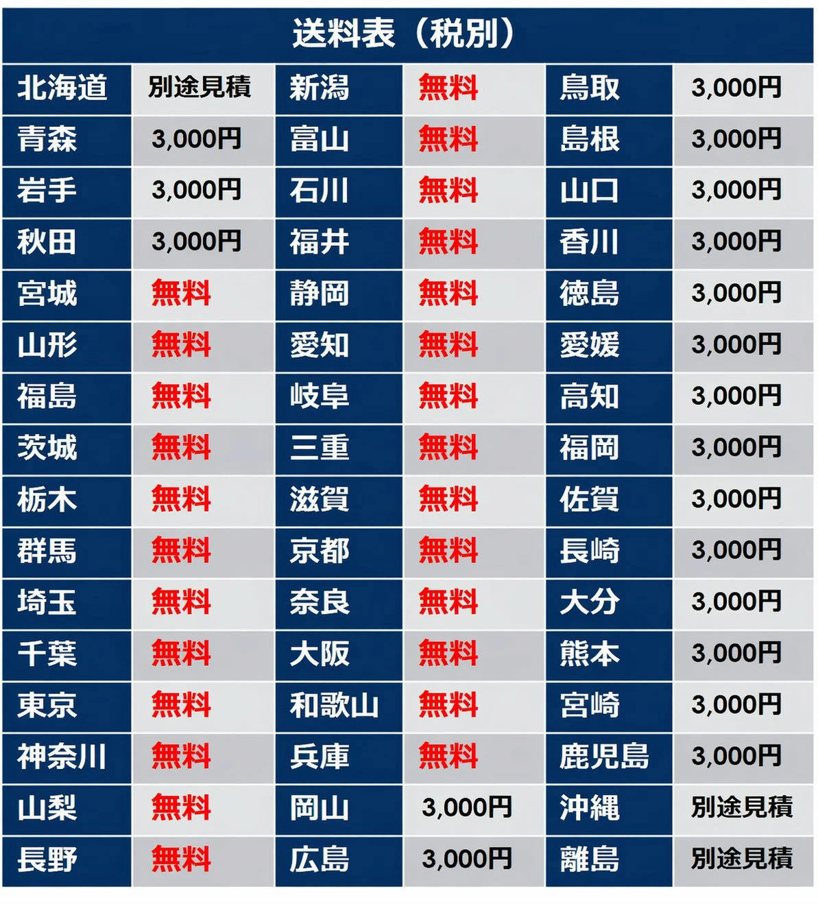 ページ下部に記載の送料表を必ずご確認ください