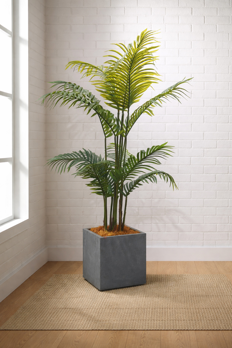 アレカヤシをモチーフにした、南国の雰囲気あふれる人工観葉植物です。