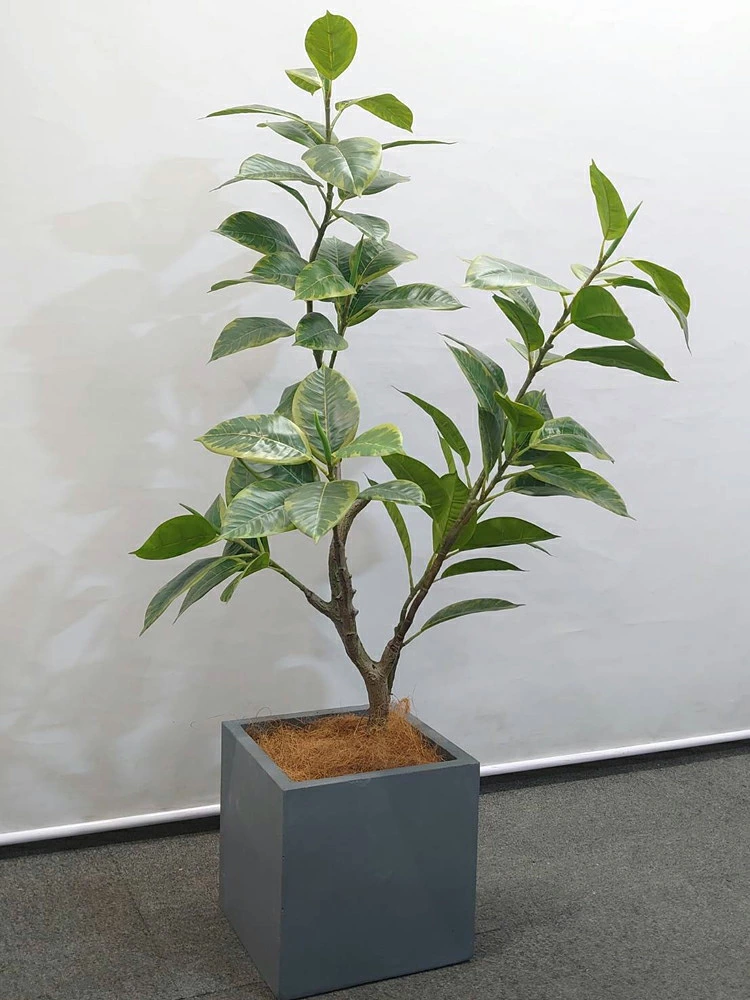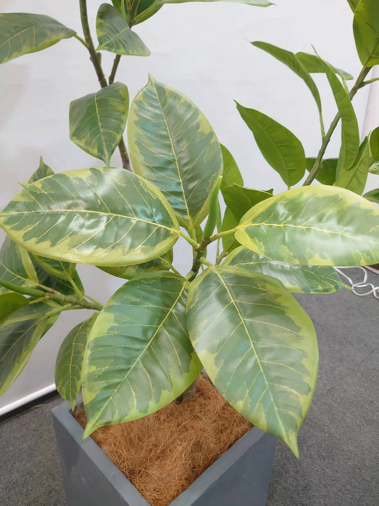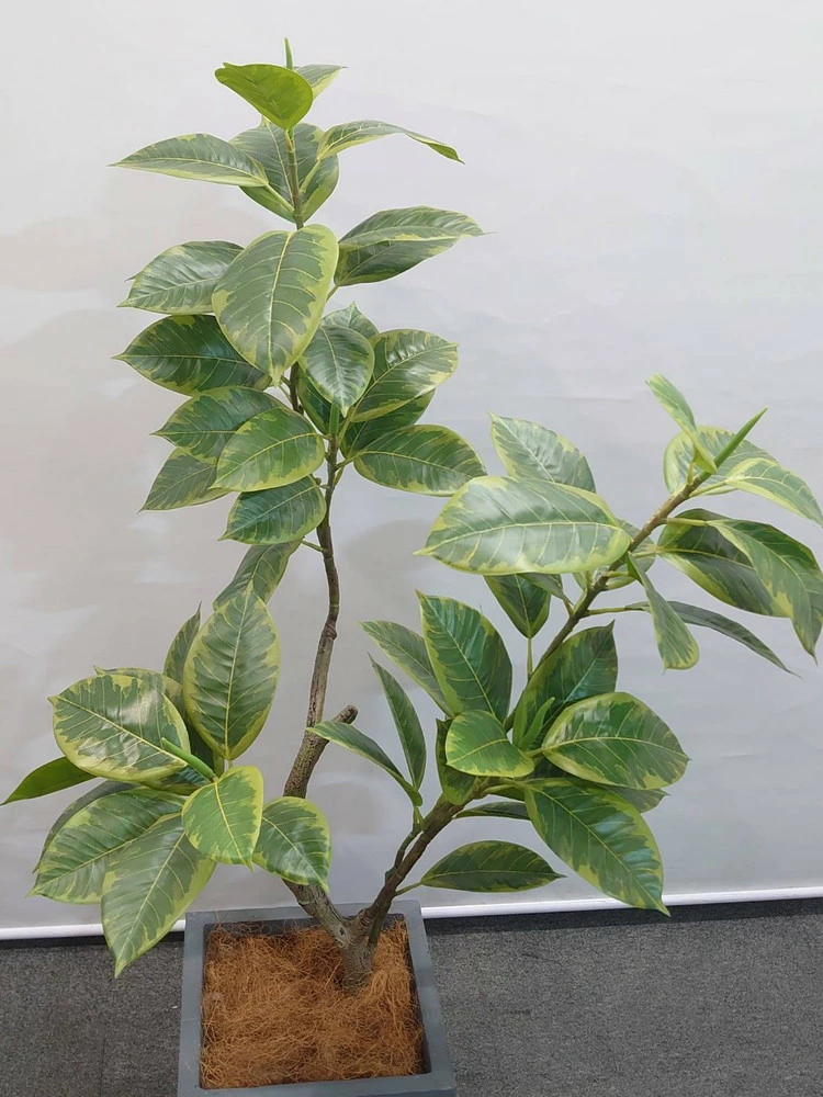 明るいグリーンとイエローの斑入り葉が特徴的な「フィカス・アルテシマ」。 空間をぱっと明るく見せてくれる人気の人工観葉植物です。