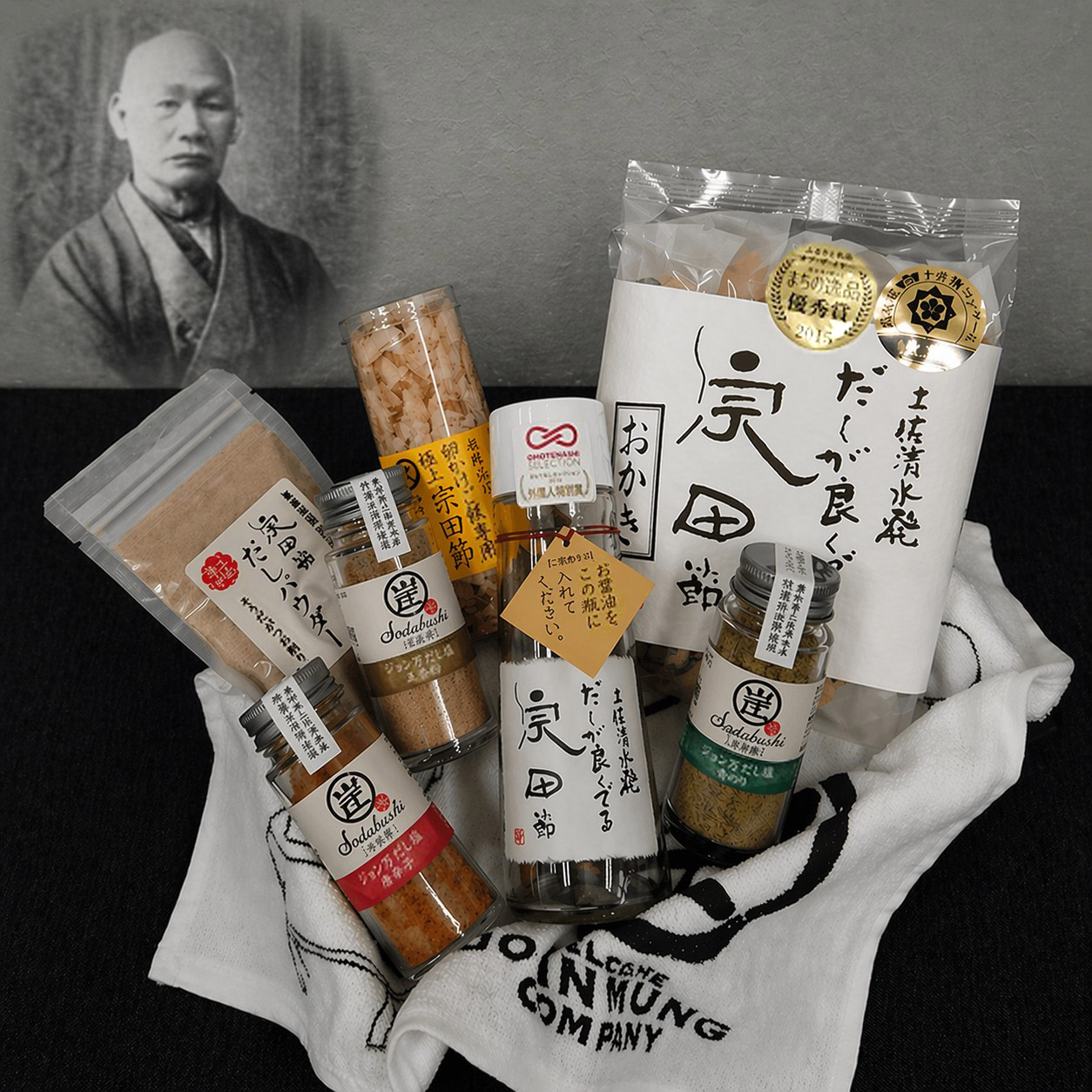 セット内容:だしが良くでる宗田節×1本、ジョン万だしパウダー(40g)×2袋、ジョン万だし塩あおさのり×1本、ジョン万だし塩唐辛子×1本、ジョン万だし塩五香粉×1本、宗田節おかき×1袋(2枚入が小袋8袋入、計16枚入)、たまごかけ専用極上宗田節×1袋、オリジナルハンドタオル×1枚