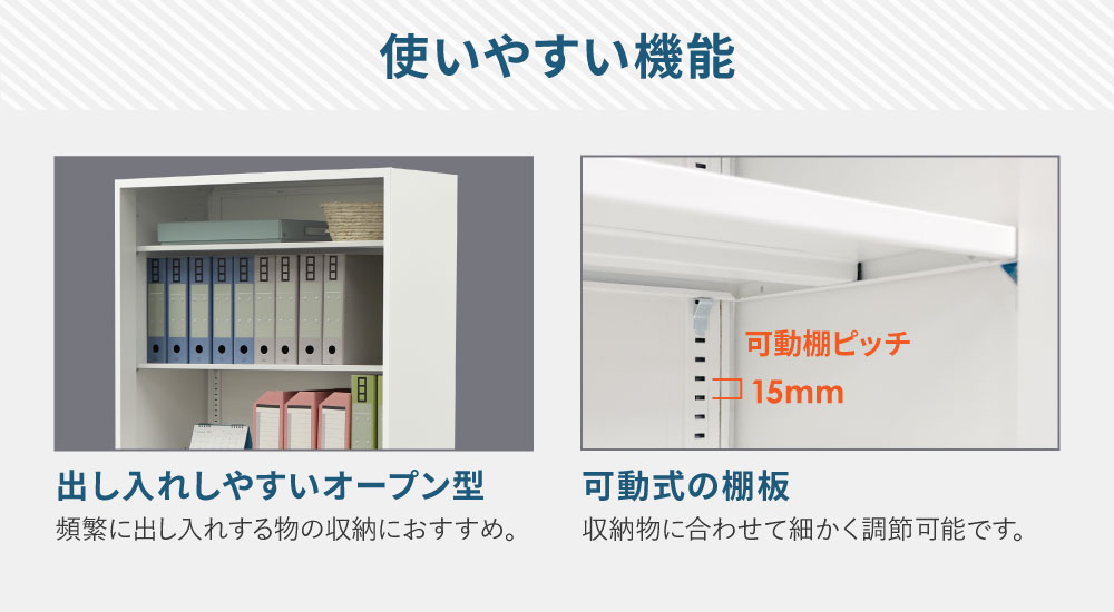 最小限の機能でコストを抑えながら、細かなピッチの可動棚で使いやすさは抜群のオープンタイプです。