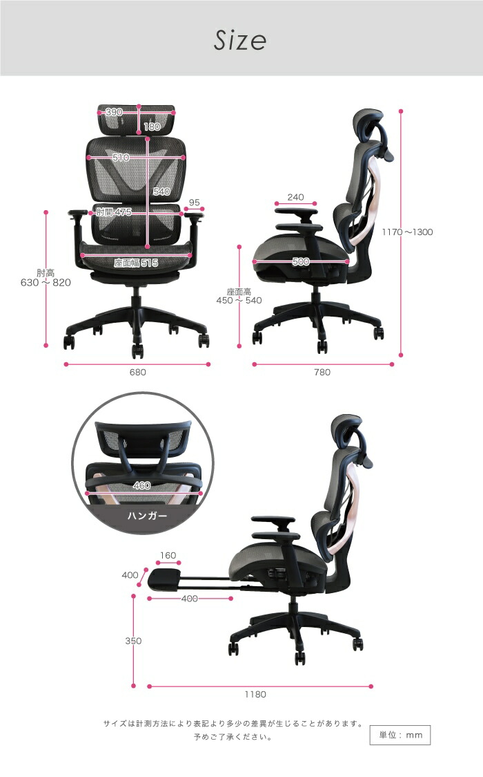 | サイズ | 外寸:幅680×奥行780×高さ1170~1300mm (フットレスト使用時 奥行1180mm) 座面高:450~540mm 重量:19.2kg |