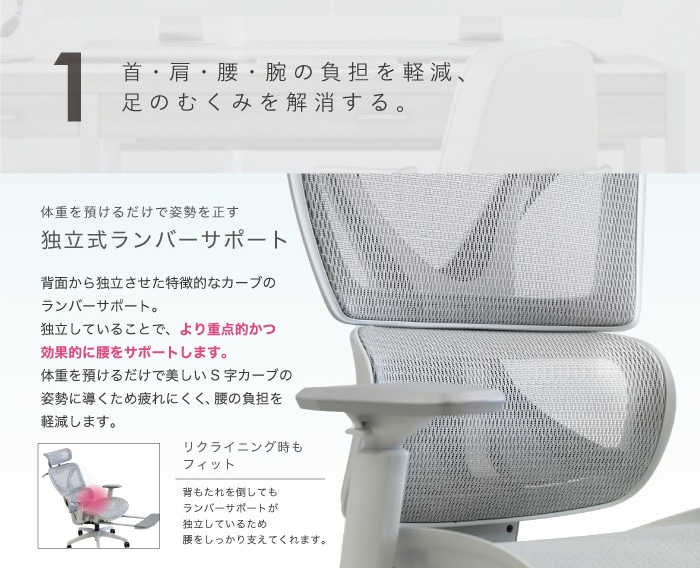 バネのようにしなやかな座り心地に、革新的な独立式ランバーサポートを搭載。背面から独立させたランバーサポートが、より重点的かつ効果的に腰を支えます。 |