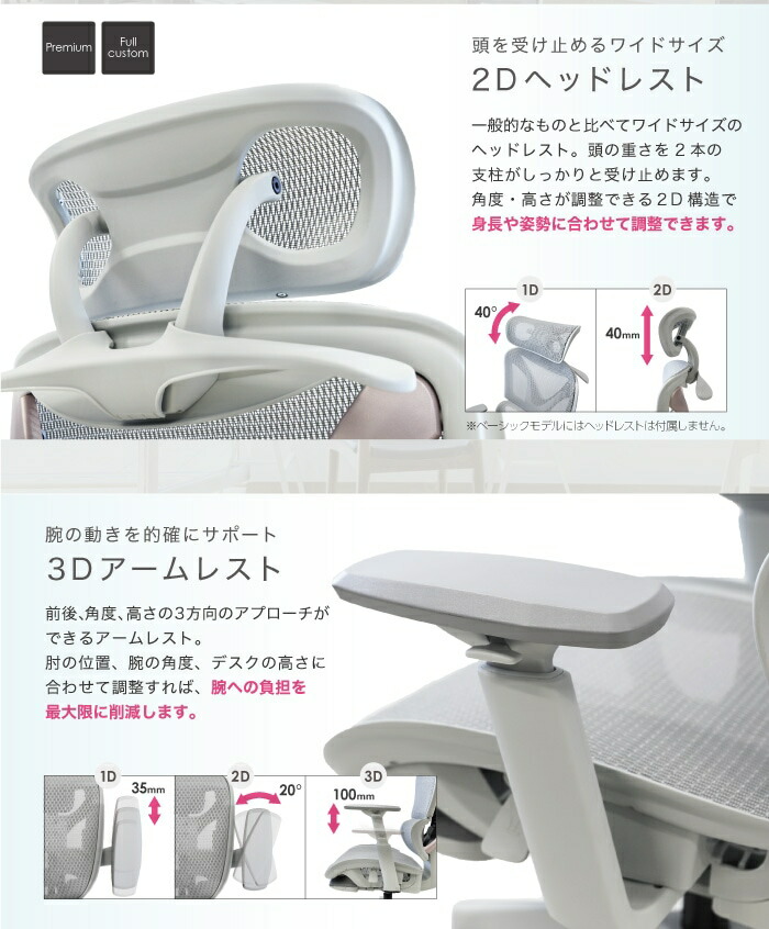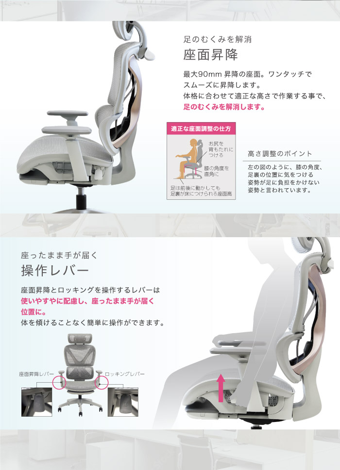 | 仕様 | 背座フレーム・肘:ポリプロピレン ヘッドレスト:ナイロン ハンガー:ナイロン 脚部・キャスター:ナイロン 生地:エラストマーメッシュ 座面前部:モールドウレタン・座面昇降(ストローク:90mm) ・ロッキング機能(最大130度) ・ロッキング固定機能(4段階) ・3Dアームレスト(昇降ストローク:100mm) |