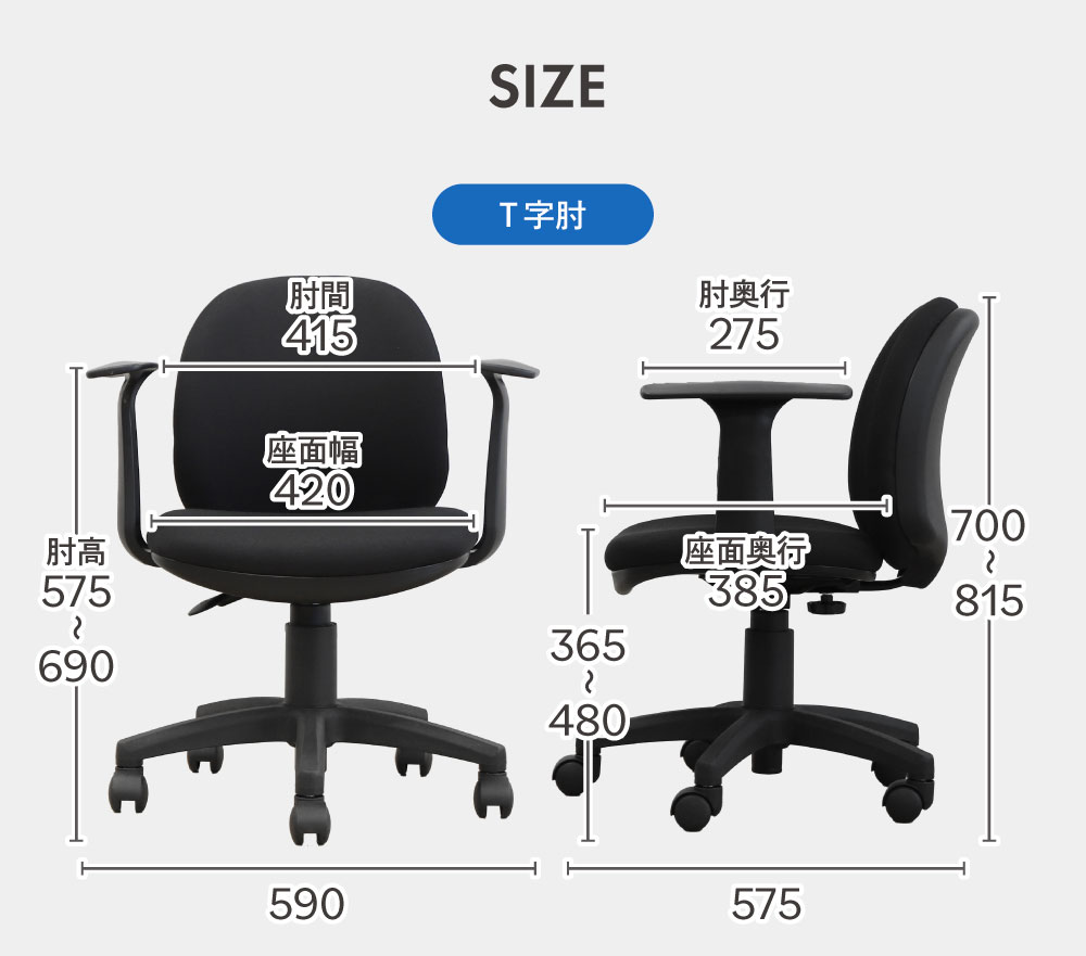 | サイズ | 外寸(T字肘):幅590×奥行575×高さ700~815(座面高365~480)mm 外寸(ループ肘):幅535×奥行575×高さ700~815(座面高365~480)mm |