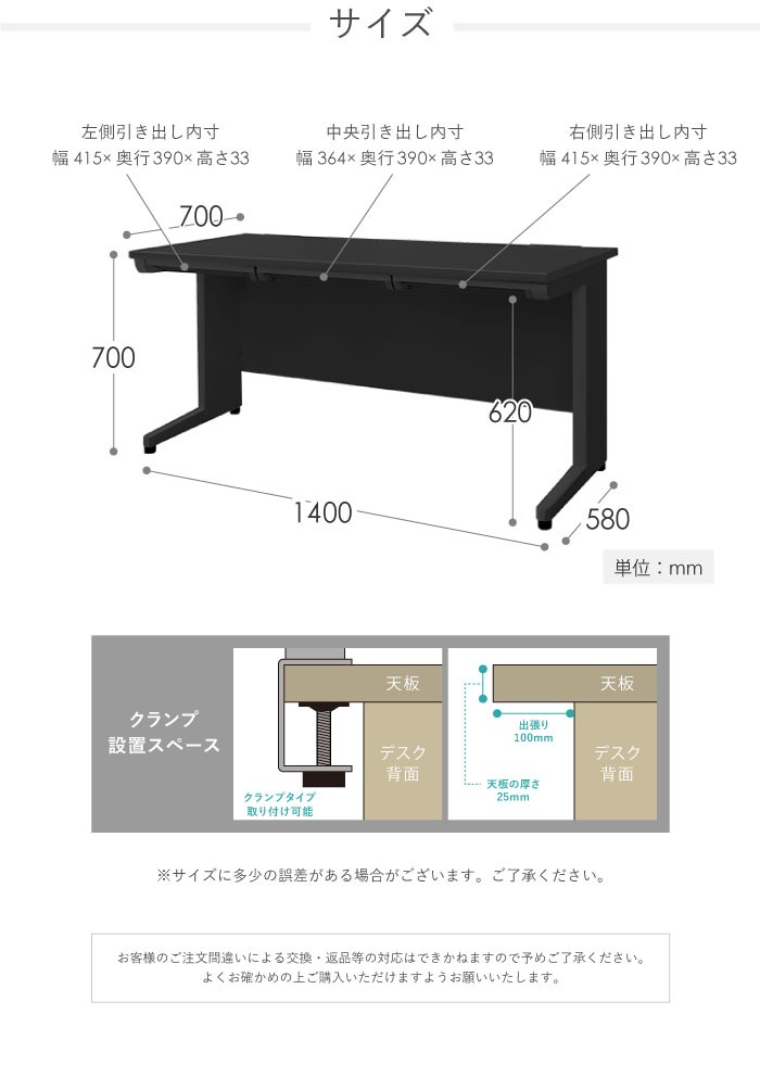 | 商品情報 | 商品名:NUTS(ナッツ)デスク ブラック 平机 幅1400mm 商品番号:LHD-147B 組立状態:お客様組立の商品(新品) 特記事項: ※配送先によって送料が異なる商品です。詳細は下記配送料欄をご確認ください。 ※カラー名称変更に伴い【-BR(旧品番)】と印字されている場合がございますが、同一商品です。ブラック天板に関しまして、仕様を一部変更させていただくこととなりました。 旧:4辺エッジ加工/新:3辺エッジ加工・1辺アール加工(手前側) ※仕様変更の移行期間においては、旧仕様と新仕様が混在する場合がございます。 付属品:- カラー: 天板カラー:ホワイト、ニューグレー、ブラック、ナチュラル(木目調)、ダークブラウン(木目調) 本体カラー:ブラック サイズ: 外寸:幅1400×奥行700×高さ700mm 左側引き出し内寸:幅415×奥行390×高さ33mm 中央引き出し内寸:幅364×奥行390×高さ33mm 右側引き出し内寸:幅415×奥行390×高さ33mm 天板厚み:約25mm 幕板から天板先までの長さ:約100mm ※商品は3梱包でお届け致します。 仕様: 天板:パーティクルボード、メラミン化粧板 脚フレーム・幕板:スチール、粉体塗装 耐荷重:天板/80kg |