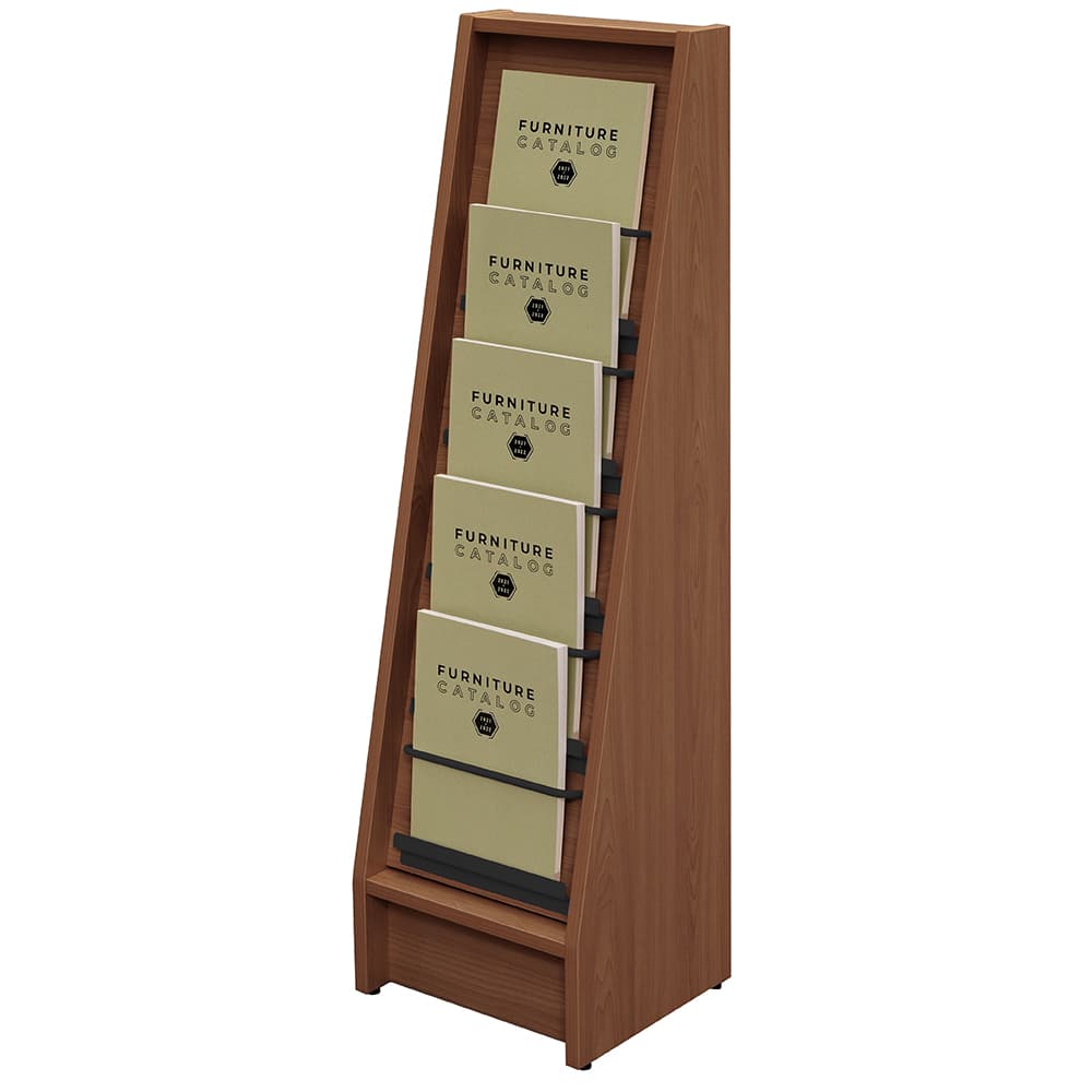収納力豊富な木製カタログスタンドのシングル。A4縦サイズを5段1列にディスプレイしながら収納できます。傾斜面の収納部は各段にカタログ受けとバーがあり前倒れを防ぎます。シンプルながらも洗練された北欧スタイルのデザインで上質な接客スペースを演出できます。