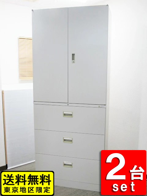 在庫8台 上下書庫 2台セット W900 H2200 両開き書庫 ラテラル書庫 キャビネット カギ付き書庫 ユニットタイプ オカムラ 42 中古