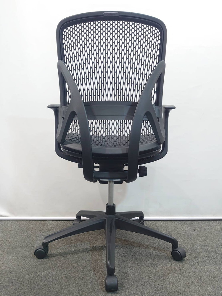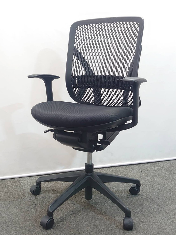 イナバ製のリユース品オフィスチェア「イエラ(Yera)」です。通気性の良いメッシュバック仕様で、快適な座り心地を実現します。ハイバックタイプで背中をしっかり支え、ランバーサポート付きで長時間のデスクワークにも適しています。肘付き・キャスター付きで移動もスムーズ。カラーはブラックです。