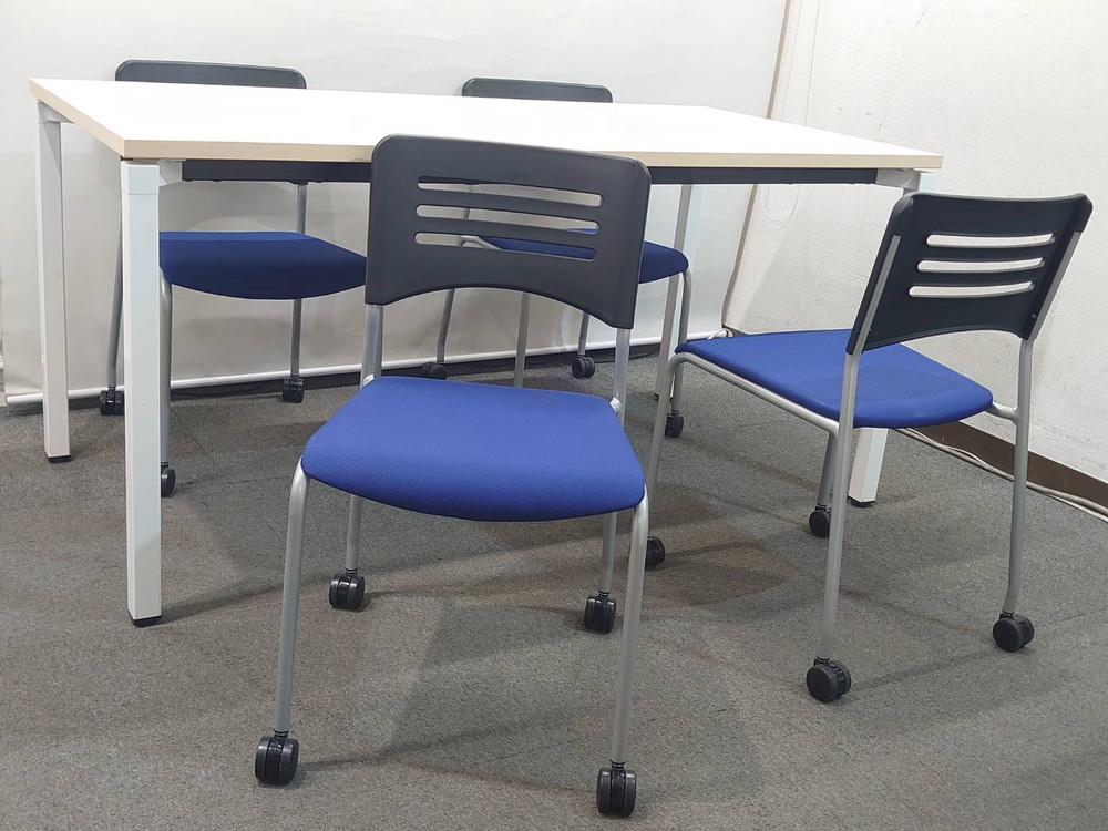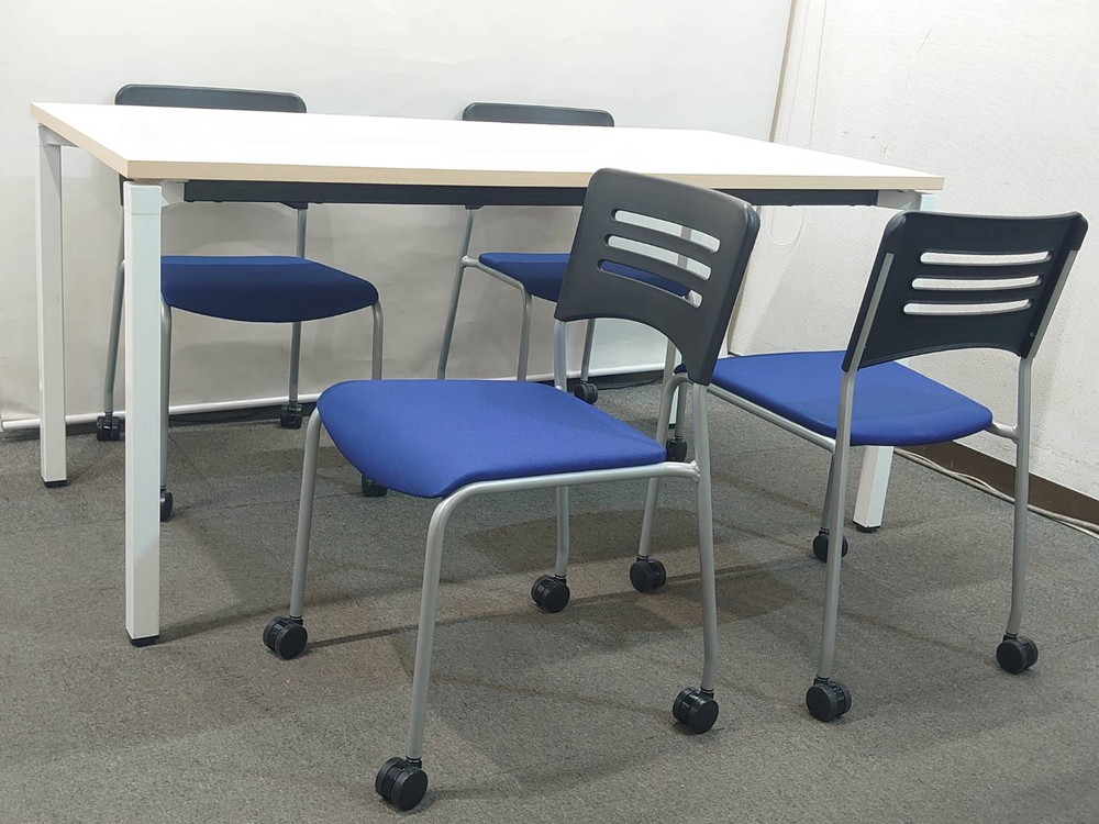 4人用の会議セットです。テーブルはコクヨ製、チェアはキャスター付きのスタッキングチェアとなります。