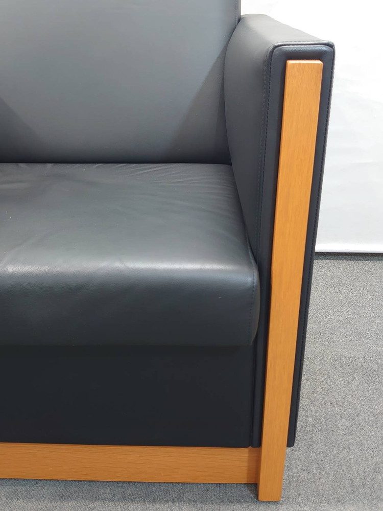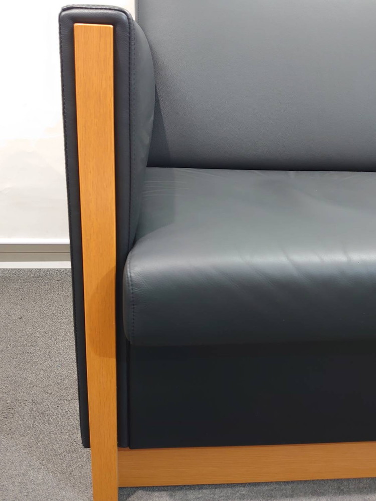 ソファはコクヨ製「タウナス」シリーズで統一されており、落ち着いたブラックカラーが役員室や応接室、商談スペースに適した空間を演出します。